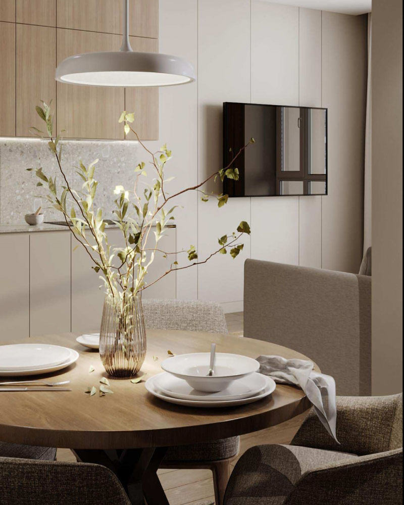 Баланс функциональности и эстетики: натуральное дерево и светлые тона в стиле современная классика.